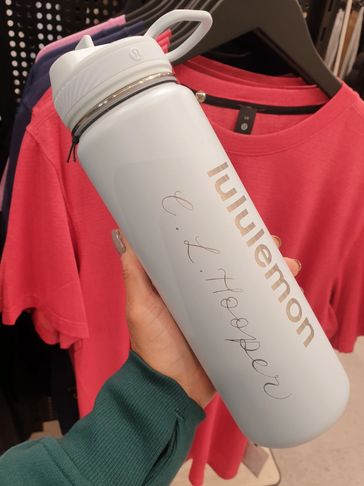 Hand Engraved stainless steel flask. Personalised live in store at Cambridge Lululemon branch, as part of their lead up to Christmas 2023.